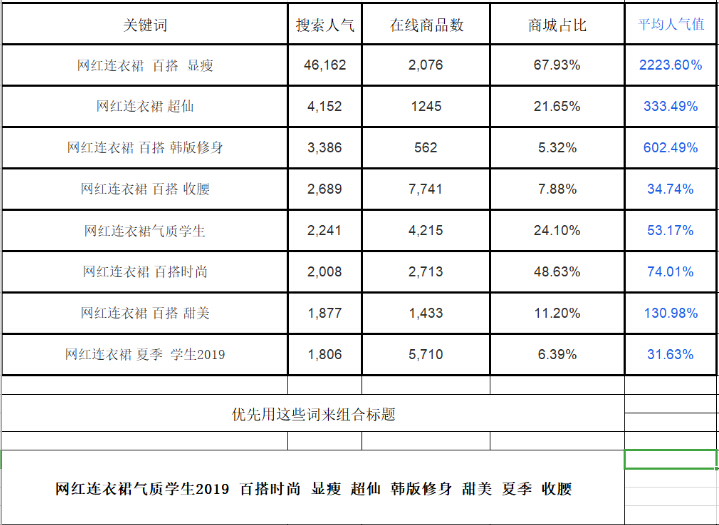 那最终组合的标题就是:【网红连衣裙气质学生2019百搭时尚显瘦超仙韩版修身甜美夏季收腰】,最后把空格删除即可。组合过程中有个非常重要的点,就是我们找到了关键词应该怎么去组合,组合的方法是什么呢?那接下来就是组合的几个要点。
